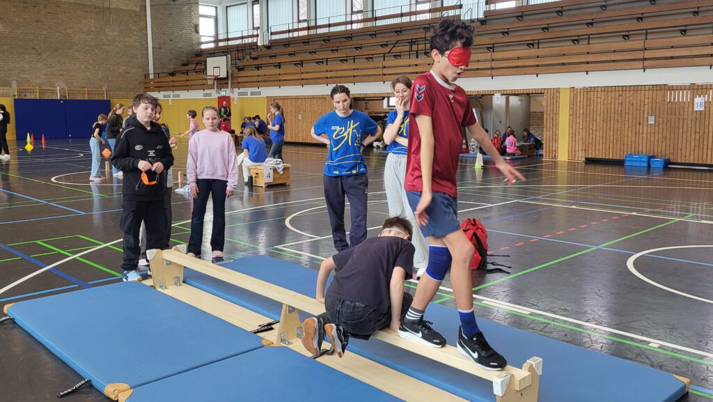 An zwei Tagen war das „Body+Grips-Mobil“ des DRK-Landesverbands Westfalenlippe an unserer Schule zu Gast. In Kleingruppen durchliefen die SchülerInnen der sechsten Jahrgangsstufe 15 verschiedene Stationen, die sich mit Themen Bewegung, Ernährung, Sexualität, Sucht und sozialem Miteinander beschäftigten. An Stationen wie „Das laufende A“ oder „Der Drahtseilakt“ wurde das gegenseitige Vertrauen und die Teamarbeit gestärkt. Auch an den Ernährungsstationen haben die SchülerInnen begeistert mitgemacht. Betreut wurden die Projekttage von ausgebildeten Sporthelfern der zehnten Klasse und der Einführungsphase.